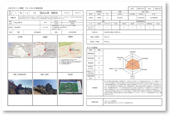 徳島県三好市では、日本ジオパークへの認定を目指し、日々活動が進められています。ジオパークに認定されるためには、ジオパークとして守っていくべき地質や地形などのある場所を“サイト”に設定し、それらを適切に管理する必要があります。三好市ではこれまで、721㎢にわたる広大な市域に90を超えるサイト候補地を設定してきましたが、管理台帳のようなものはまだ整備されていませんでした。そこでジオパークでの豊富な経験を擁する弊社が、サイトカルテの作成をお手伝いすることとなりました。
