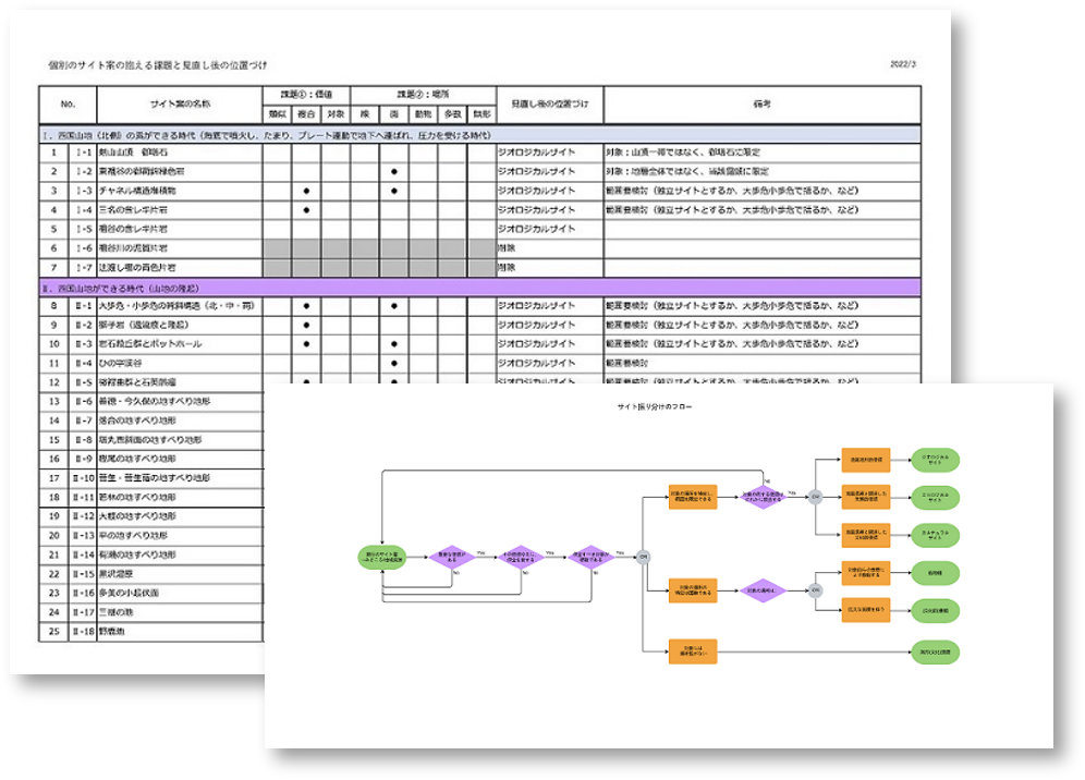 最後に、これまでの調査結果をサイトカルテにとりまとめ、各サイトの情報を一元管理できるように整理しました。その過程で、三好市におけるサイト候補地の設定には、守るべき価値が似通ったサイトがあまりに多かったり、「そば畑」のように場所が1ヶ所に限定できないサイトがあったりするなど、いくつかの課題があることが明らかになりました。そこで改めて1つ1つのサイト候補地の価値を見定め、それぞれの最適な位置づけをご提案しました。これらは、“三好ジオパーク”構想でのサイト設定の検討の礎として、活用いただいています。