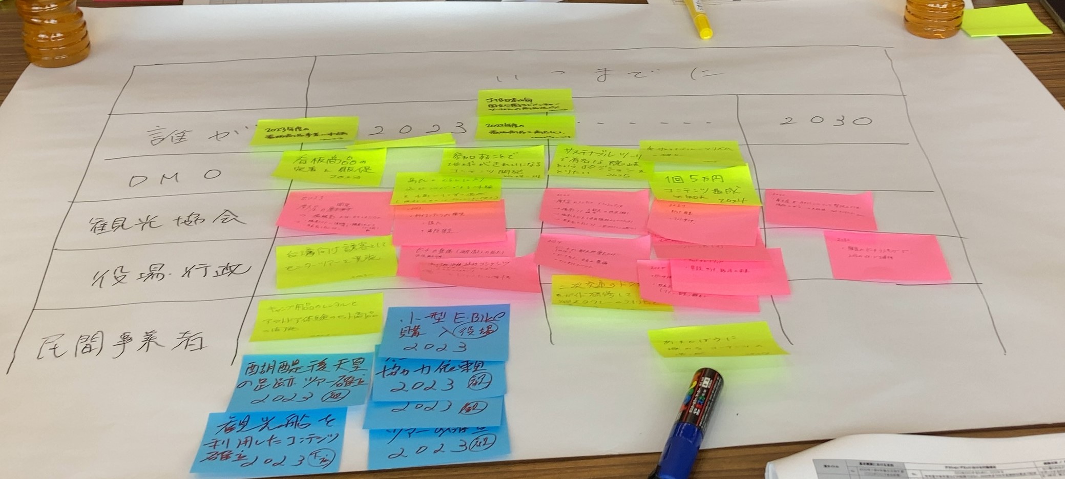 また、推進機構のスタッフだけでなくジオパークや観光に携わる関係者の意見や考えを取り込むため開催されたワークショップでは、議論を円滑に進めるためのファシリテーターを務めました。形だけのものでなく実際に活用されるアクションプランにするため、ワークショップの参加者にも行動項目の提案を募ったり、基本構想を実現するには「いつ」「誰が」「何を」すればよいかといった論点を提示したりしながら、進行しました。