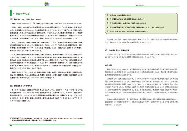 また、1つ1つのサイトにおける遺産をどう守っていけばよいか、過去の日本ジオパークネットワーク全国研修会で導き出された5つのステップに基づいて検討を重ね、サイトごとの保全方針も整理しました。