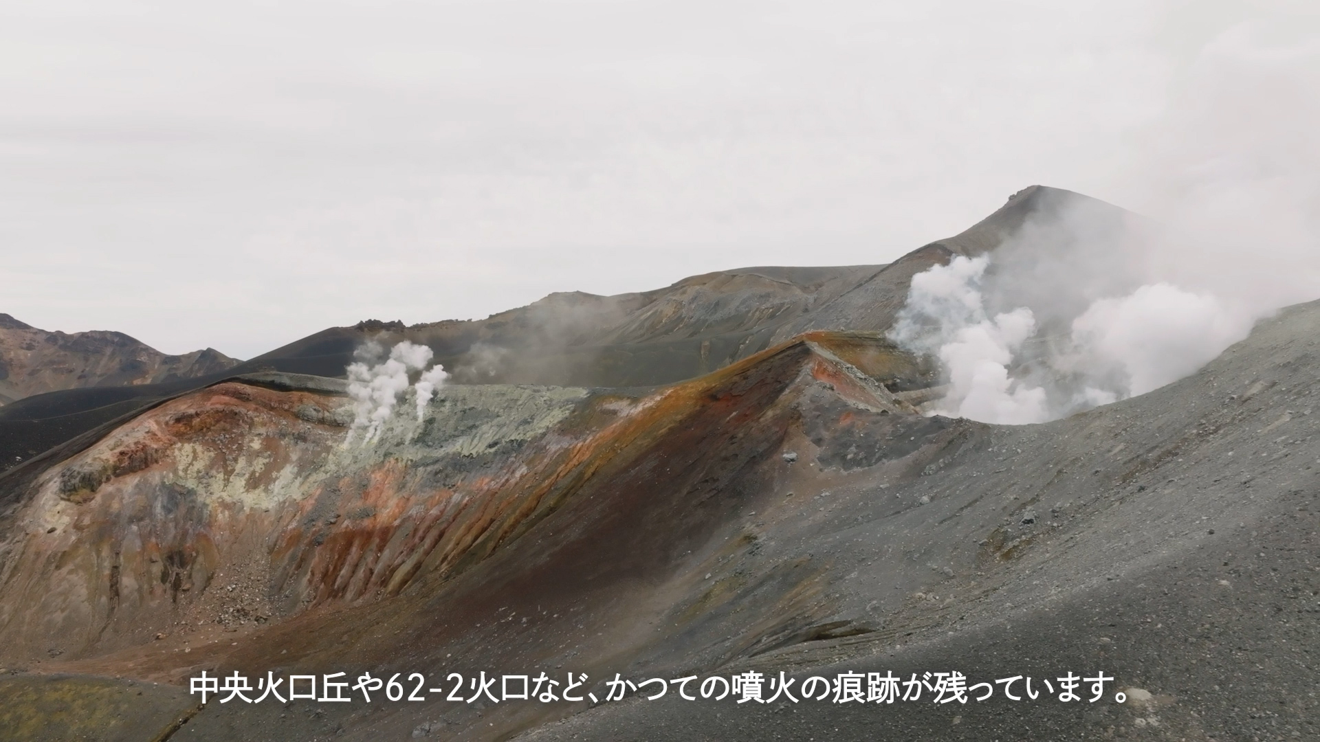 今回制作した映像コンテンツは、「十勝岳編」と「大正泥流編」の2本です。「十勝岳編」では、現在も噴気を上げ続ける火口部のドローン空撮映像に加え、噴火後に変化した植生や、美瑛・上富良野の町に残る火山由来の建材などに焦点を当て、自然と人の共生の様相を映像で描き出しました。
