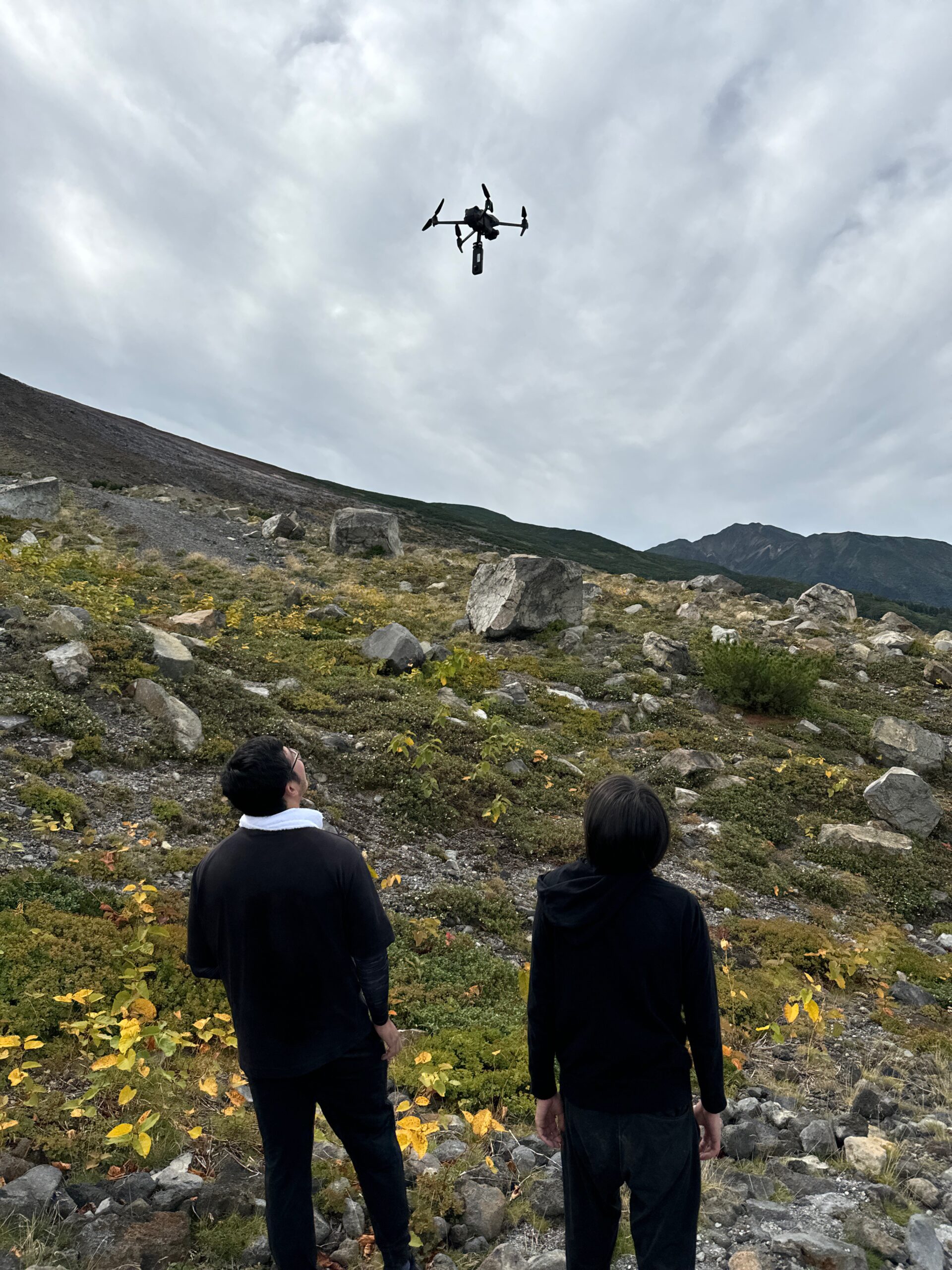加えて、ドローンによる空撮映像を用いたVRコンテンツも制作しました。十勝岳火山砂防情報センターを飛び立ち、上空から十勝岳の山容や砂防堰堤、青い池を巡る空中散歩を楽しめる内容となっており、施設来訪者に新たな没入型の体験を提供しています。